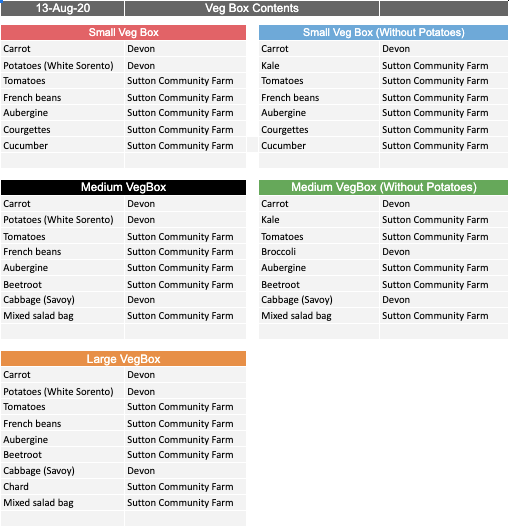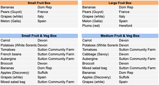 Useful links:   Online Shop    |    Recipe Bank    |    Top Tips for Storing your Veg    |    COVID-19 Updates Scroll down to view our planned contents and please note that it is subject to availability. Log in to your account – Please make any changes to products*, fruit or veg dislikes, delivery address or instructions before midnight on Sunday. Changes made after this point will not be processed until the following week. *And don’t forget you can also add or make up your own bag from individual portions of fruit ‘n’ veg, bread, eggs, honey and grains and pulses we offer!