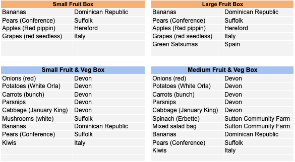 *And don’t forget you can also add or make up your own bag from individual portions of fruit ‘n’ veg, bread, eggs, honey and grains and pulses we offer!