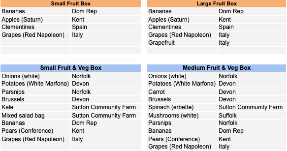 *And don’t forget you can also add or make up your own bag from individual portions of fruit ‘n’ veg, bread, eggs, honey and grains and pulses we offer!