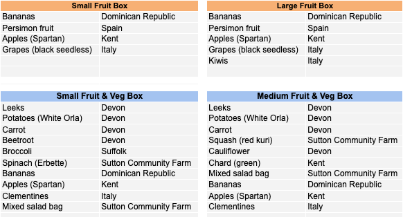 *And don’t forget you can also add or make up your own bag from individual portions of fruit ‘n’ veg, bread, eggs, honey and grains and pulses we offer!