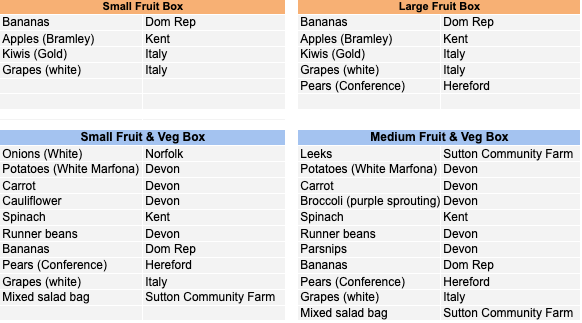 *And don’t forget you can also add or make up your own bag from individual portions of fruit ‘n’ veg, bread, eggs, honey and grains and pulses we offer!