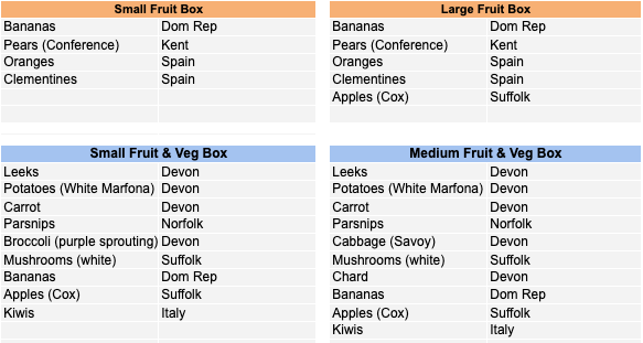 *And don’t forget you can also add or make up your own bag from individual portions of fruit ‘n’ veg, bread, eggs, honey and grains and pulses we offer!